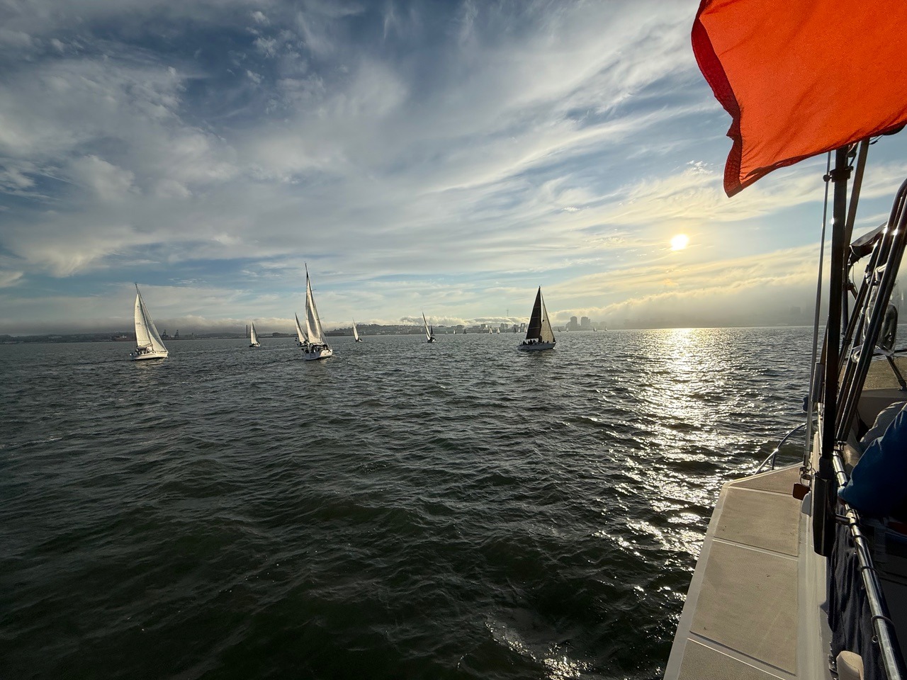 Slower boats start first on PHRF-timed intervals. The fleet compresses toward a single finish. First across the line wins.